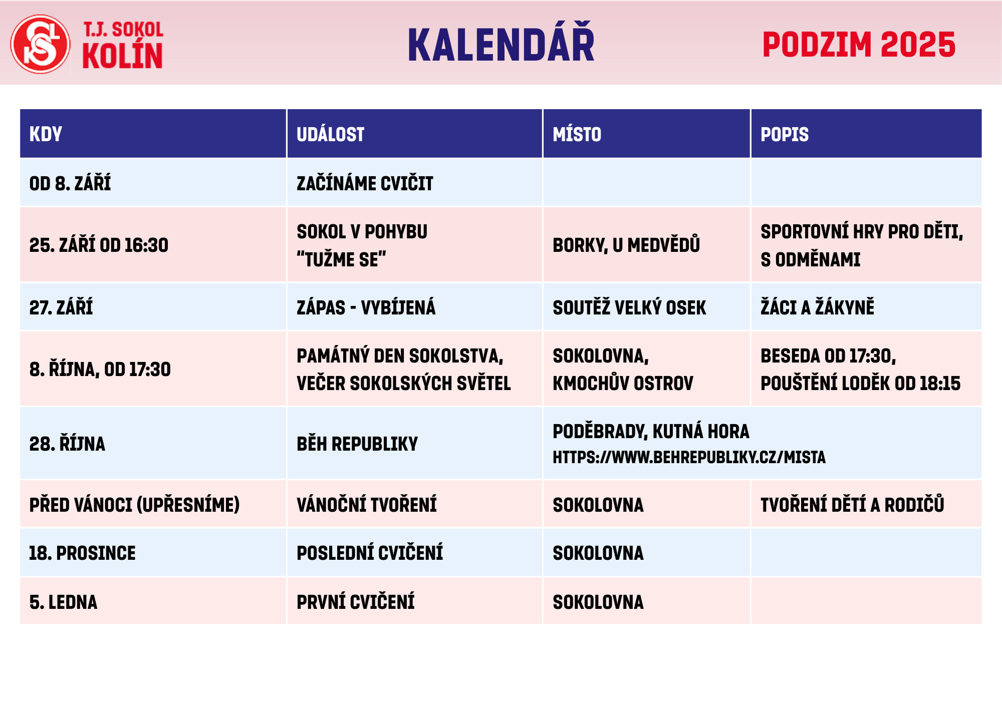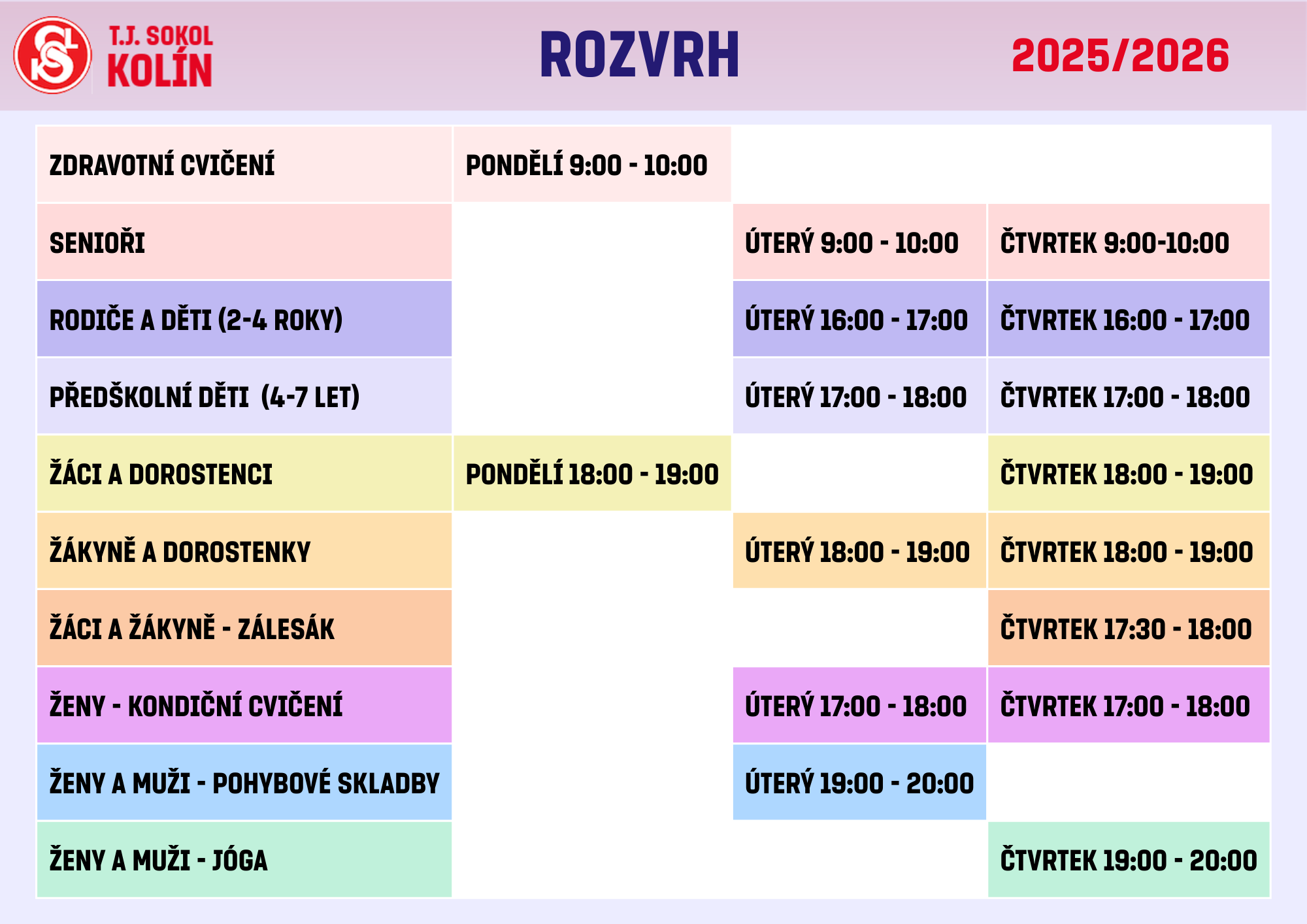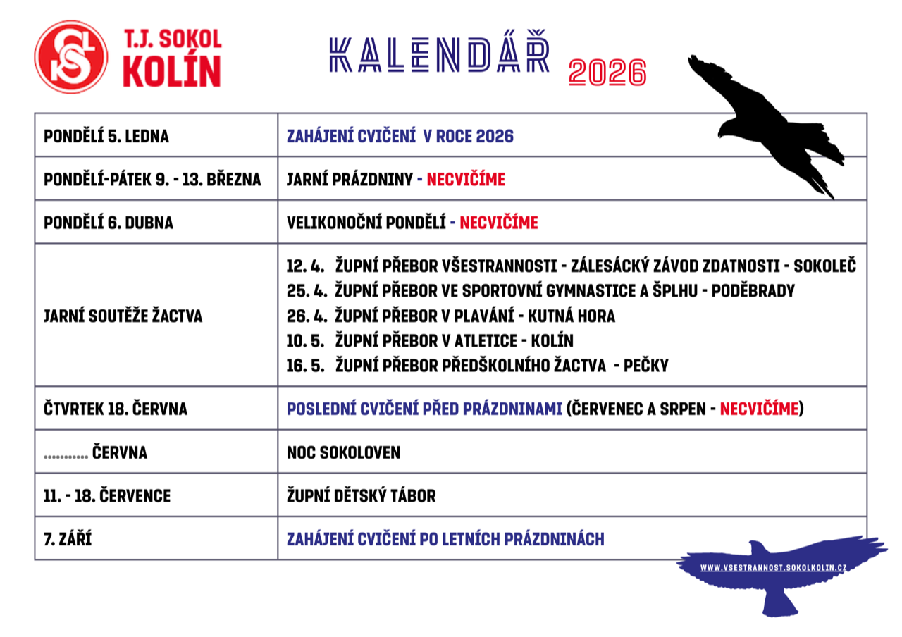 Vítán je každý, Sokolové cvičí zdarma, ostatní poprosíme o 100 Kč za lekci. Těšíme se na Vás.